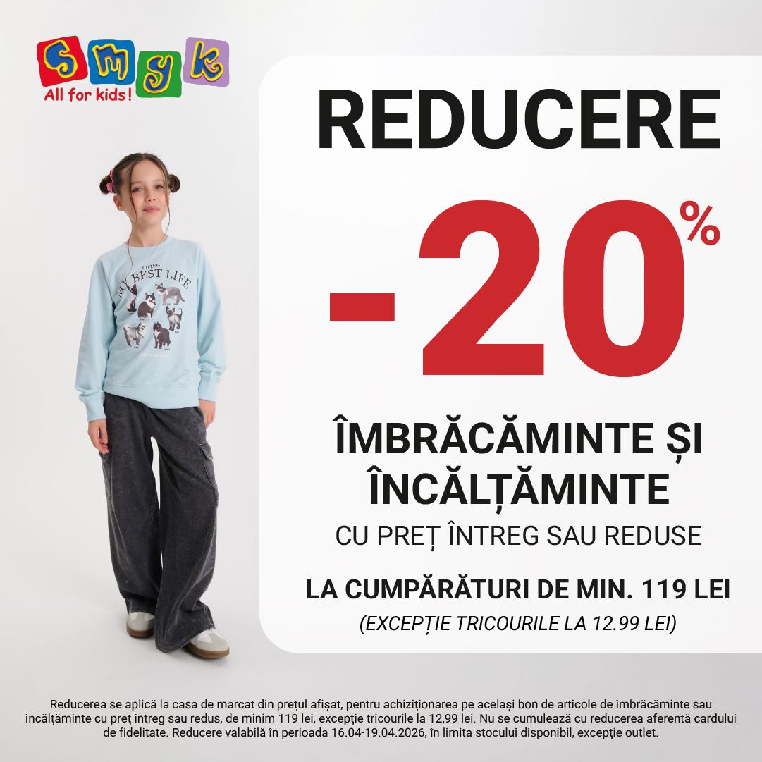 *Oferta valabilă în perioada 13-30.04.2026 în magazin, pentru o selecție de produse, în limita stocului disponibil, cu excepția celor deja aflate în alte reduceri. Oferta este supusă unui regulament, disponibil la casa de marcat.